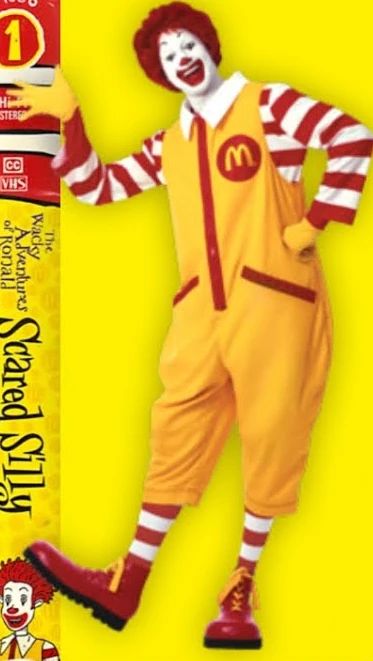Ronald McDonald is the primary icon of McDonald's. He is a clown with red hair and a big red smile who wears on a yellow suit and red shoes. He also wears a red and white striped shirt underneath with yellow gloves in 1963. Originally, he looked nothing compared to who he is today, wearing a yellow and red striped suit with a tray of a McDonald's Hamburger, french fries, and milkshakes. He also used it as a hat too. From 1971 to 2009 (Spring 2009 in the last McDonaldland commercials), Ronald's suit had french fry bags for pockets with two large ones around the lower body and an average sized french fry bag on the heart. The sleeve and leg stripes were thin, and the neck collar was long. Starting with The Wacky Adventures of Ronald McDonald, in 1998, Ronald wore a different looking suit replacing the french fry bag pockets, with standard red ones and the one on the heart being a red circle with the "M" in the center. The neck collar also slightly shrunk in a smaller appearance and the stripes are thicker. This would become their permanent look starting in 2009. Ronald, Grimace, Birdie and Fry Kids now interact with a birthday child in claymation, as he used to in the McDonaldland era. He was first portrayed by Willard Scott (who also played Bozo the Clown) and various other actors over the years. Although he seldom appears after 2016 due to clown scares in recent years.